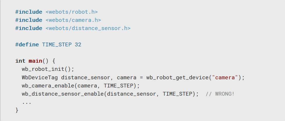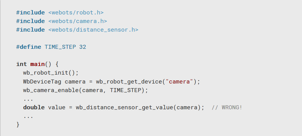 WbDeviceTag是用於在Webot中標識模擬設備的抽象引用(或句柄)。 必須從wb_robot_get_device函數獲取任何WbDeviceTag。 然後,它用於在各種Webots函數調用中指定設備。 當傳遞給Webots函數的WbDeviceTag似乎與已知設備不符時,Webots發出此警告。 發生這種情況主要有以下三個原因: