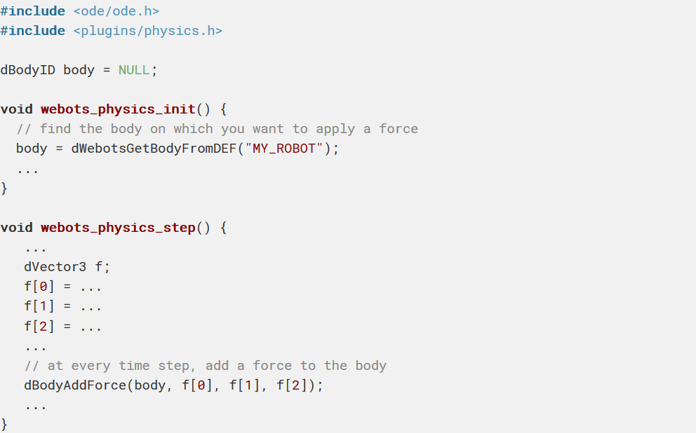 在參考手冊中有關於插件功能的更多信息。 有關ODE功能的其他信息,請參見此處。 您可能還想研究與Webots一起分發的此示例: