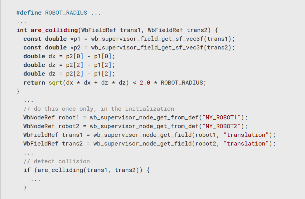 - 在主管代碼中:您可以通過使用wb_supervisor_field_get_ *函數跟踪機器人的位置來檢測衝突。 這是一個簡單的示例,假設機器人是圓柱形的並且在xz平面中移動。
