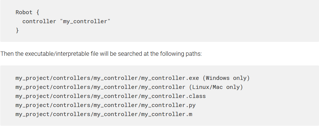 此消息意味著Webots既找不到可執行文件(例如.exe),也找不到解釋語言文件(例如.class,.py,.m)作為機器人的控制器程序運行。 實際上,Webots需要將每個控制器文件存儲在特定位置,以便能夠執行它。 請求的位置在當前Webots項目目錄的“ controllers”子目錄中。 “我的項目”。 在“ controllers”目錄中,每個控制器項目必須存儲在其自己的目錄中,該目錄的名稱必須與Robot的controller字段完全相同。 在該目錄內,可執行文件/可解釋文件也必須以Robot的controller字段命名(加上可能的擴展名)。 例如,如果機器人的控制器字段在“場景樹”中如下所示: