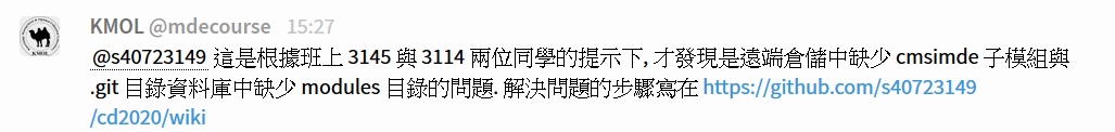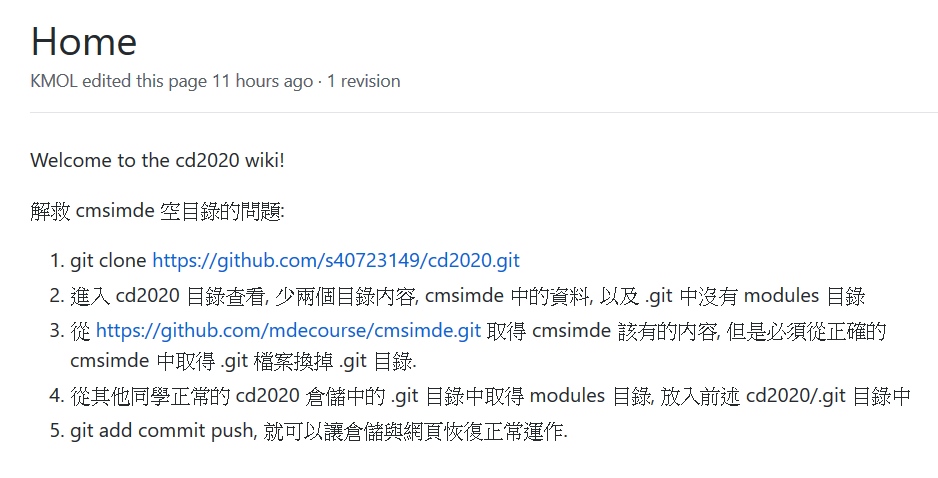後來請教老師,老師才發現原來我在無意間動到了cmsimde這個資料夾導致整個亂掉裡面都是空的。難怪無法commit,來有其他同學也有遇過類似的事情但沒有我的那麼嚴重。後來老師fork進來我的倉儲嘗試幫我搶救,還真的搶救成功了。